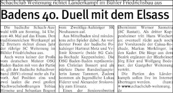 Die badische Schach-Auswahl trifft am Sonntag, 14 Uhr, zum 40. Mal auf das Elsass. Den traditionsreichen Wettkampf an 32 Brettern richtet dieses Jahr der rührige SC Weitenung im Bühler Friedrichsbau aus. Auch wenn keiner der Profis vom deutschen Meister OSG Baden-Baden mit von der Partie ist, gilt der Badische Schachverband (BSV) einmal mehr als Favorit. Auf Position eins und zwei laufen die zwei großen Nachwuchshoffnungen Tobias Hirneise und Sebastian Bogner vom Zweitliga-Aufsteiger SK Neuhausen auf. Aus Mittelbaden sind mindestens zehn Spieler dabei. An vorderster Front der badische Pokalsieger Hartmut Metz und Velimir Kresovic (beide SG Caissa-Rochade Kuppenheim). Die OSG Baden-Baden repräsentieren Christian Bossert und als stärkste Dame Bundesligaspielerin Iamze Tammert. Zudem kommen als Jugendliche Lukas Fiderer und Alexander Srokovskiy zum Einsatz. Eines der Seniorenbretter übernimmt Werner Szenetra (SC Rastatt). Als dritter Kuppenheimer tritt Hans Wiechert an; eventuell rückt auch noch der Vorsitzende der Caissa-Rochade, Markus Merklinger, in den Kader. Die Riege aus dem Bezirk ergänzen der Iffezheimer Jörg Eiler und Wolfgang Bodemer, der Gastgeber Weitenung vertritt. Die Partien des Länderkampfs sollen live im Internet übertragen werden. (Hartmut Metz)