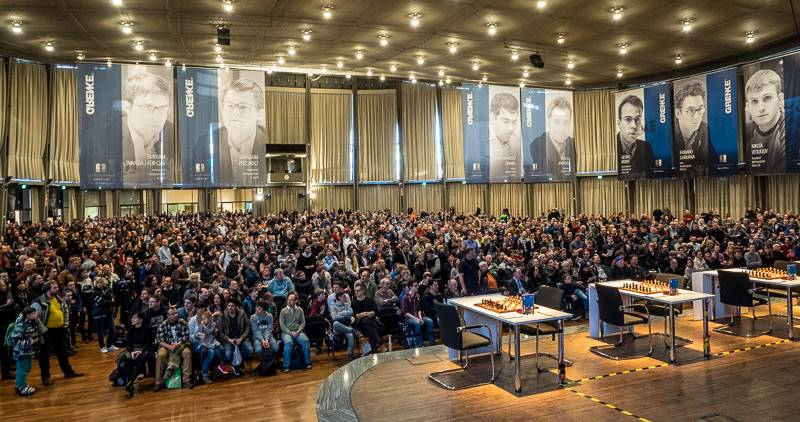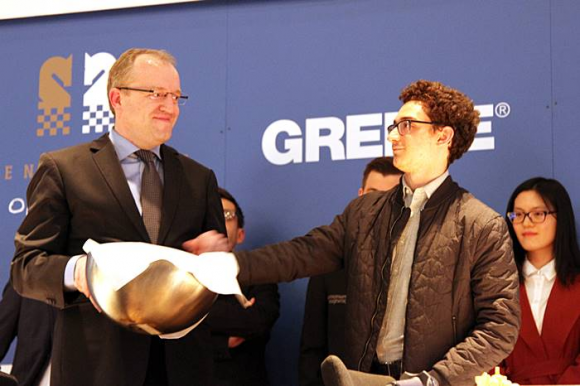 Alle Großmeister mussten nacheinander auf die Bühne, um ihre Startnummer aus einer Schüssel zu ziehen. Magnus Carlsen zog die Nr. 10 und somit war klar, dass er die erste Partie mit Schwarz spielen muss. Als Fabiano Caruana die Nr. 1 zog, war zudem klar, dass es gleich zu Beginn des Großmeisterturniers zu einer kleinen WM-Generalprobe zwischen dem amtierenden Weltmeister und seinem Herausforderer kommen wird. Carlsen und Caruana treffen außerdem, und das ist sehr ungewöhnlich, zum vierten Mal hintereinander bei einem geschlossenen Turnier in der ersten Runde aufeinander. Darauf wies der norwegische Schachjournalist Tarjei J. Svensen auf Twitter hin und fragte gleichzeitig nach der Wahrscheinlichkeit.