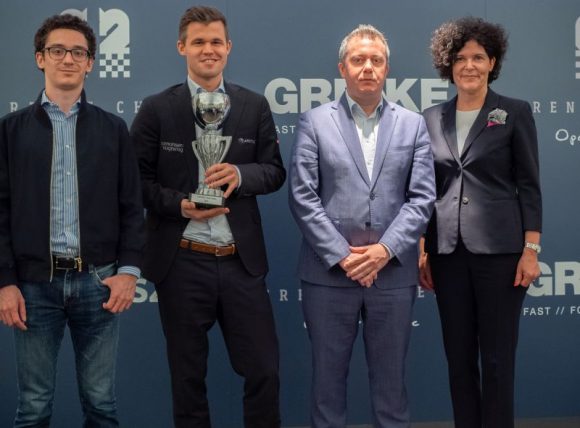 Magnus Carlsen beendete die GRENKE Chess Classic 2019 in souveräner Manier. Obwohl ihm ein halber Punkt zum ersten Platz gereicht hätte, spielte er auch in der letzten Runde gegen Maxime Vachier-Lagrave voll auf Sieg und wurde belohnt. Der Weltmeister beendete das Turnier mit sagenhaften 7,5 Punkten aus neun Partien. Den zweiten Platz belegte Fabiano Caruana nach seinem Remis gegen Levon Aronian mit 6,0 Punkten. Der dritte Platz geht mit 5,0 Punkten an Arkadij Naiditsch, der zum Abschluss Georg Meier besiegte.