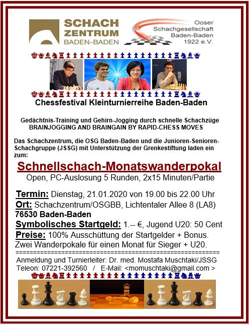 Einladung des Schachzentrums und der OSG Baden-Baden zum Rapid.Chess: SZ-OSG-JSSG-Schnellschach-Monatswanderpokal
