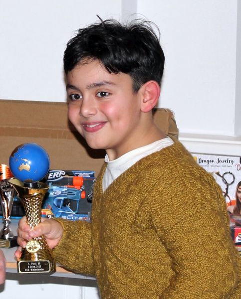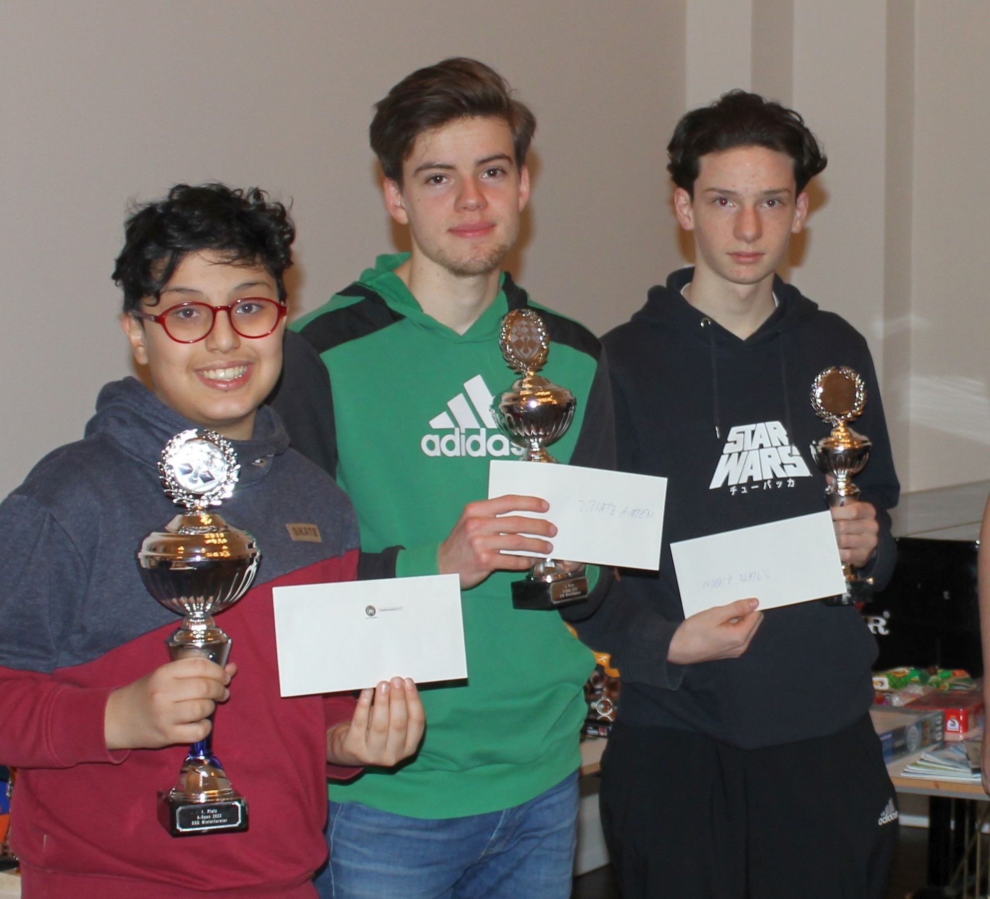 Im A-Open waren drei Spieler über 1.700 DWZ schnell als Favoriten ausgemacht.. Doch schon früh gab es Überraschungen, als sich nur Jonathan Rügert durchsetzen konnte und die beiden anderen stolperten. Nach drei Runden hatten nur der Topfavorit und der erst 11-jährige Arash Baihaghi 3 Siege erreicht. Arash bewies Nervenstärke und mit etwas Glück gewann er das direkte Duell und sicherte sich mit einem Remis mit insgesamt 4,5 Punkten aus 5 Spielen und einer sensationellen DWZ Performance von über 2.000 Platz 1 im A-Open. Platz 2 holte sich der für Neureut spielende Jonathan Rügert mit prima Endspieltechnik vor dem Neumühler Gilbert Noé, dem Gewinner des C-Opens beim Herbstopen. Bestes Mädchen und auch Gesamtbeste bei der U10 wurde Ela-Marie Kübart vom SK Radolfzell.Platz 1-3 v.L. Arash Baihaghi-Jonathan Ruegert-Guilbert Noe