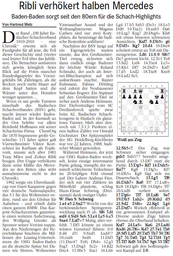 Artikel in der Schachkolumne des Badischen Tagblatt vom 9.7.2010