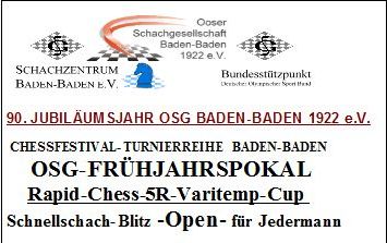 17 Teilnehmer im Alter von 11 bis 83 Jahren duellierten sich beim 5-rundigen Blitz-Schnellschach-Frühjahrspokal, der am 23.05.2012 vom Schachzentrum und von der OSG Baden-Baden ausgerichtet wurde. Der Turnierleiter Mostafa Muschtaki nennt dieses Kleinturnier mit unterschiedlichen Blitz-Bedenkzeiten der Runden: OSG/SZ-Rapid-Chess-5R-Varitemp-Spring-Cup. Es ist eins von vier Kleinturnieren, die jährlich nach den vier Jahreszeiten (Winter-, Frühjahrs-, Sommer- und Herbstpokal) veranstaltet werden. Der Sommerpokal findet am Sa., 18.08.2012 um 15.00 Uhr im Kulturhaus LA8 in Baden-Baden statt.