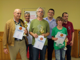 Bild v.l.n.r. Lutz Schäfer, stellvertretender Bezirksvorsitzender Erich Renschler, Hubert Wessbecher, Turnierleiter Bernhard Ast, Marco Riehle und Vereinsvorsitzender Wolfgang Schell |
